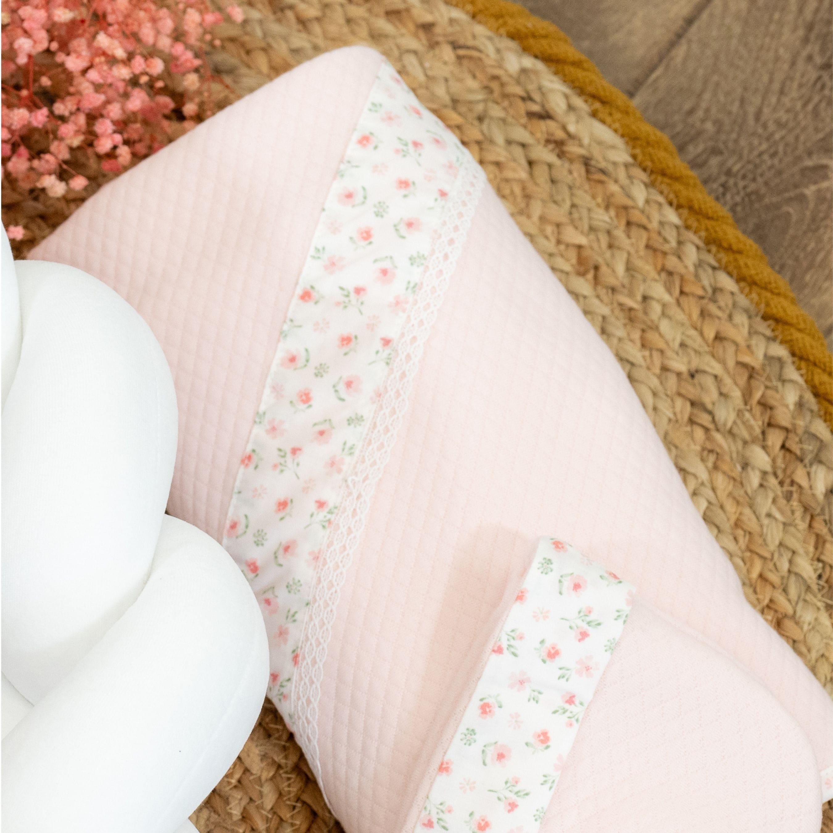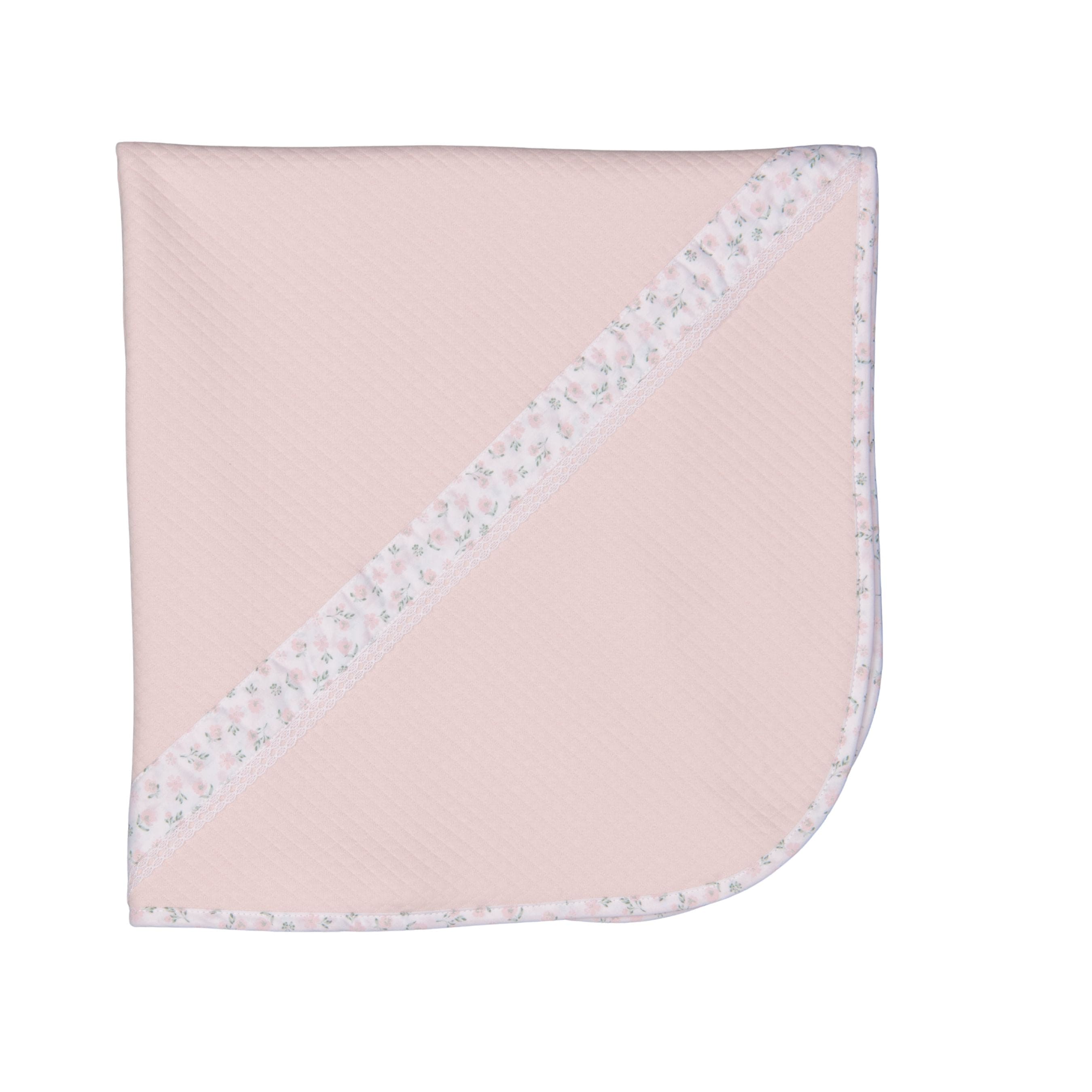 Soft and refined baby blanket crafted from pink quilted cotton, designed to provide warmth and comfort from the very first days. Finished with a delicate floral trim and lace detail, adding a timeless and feminine touch.