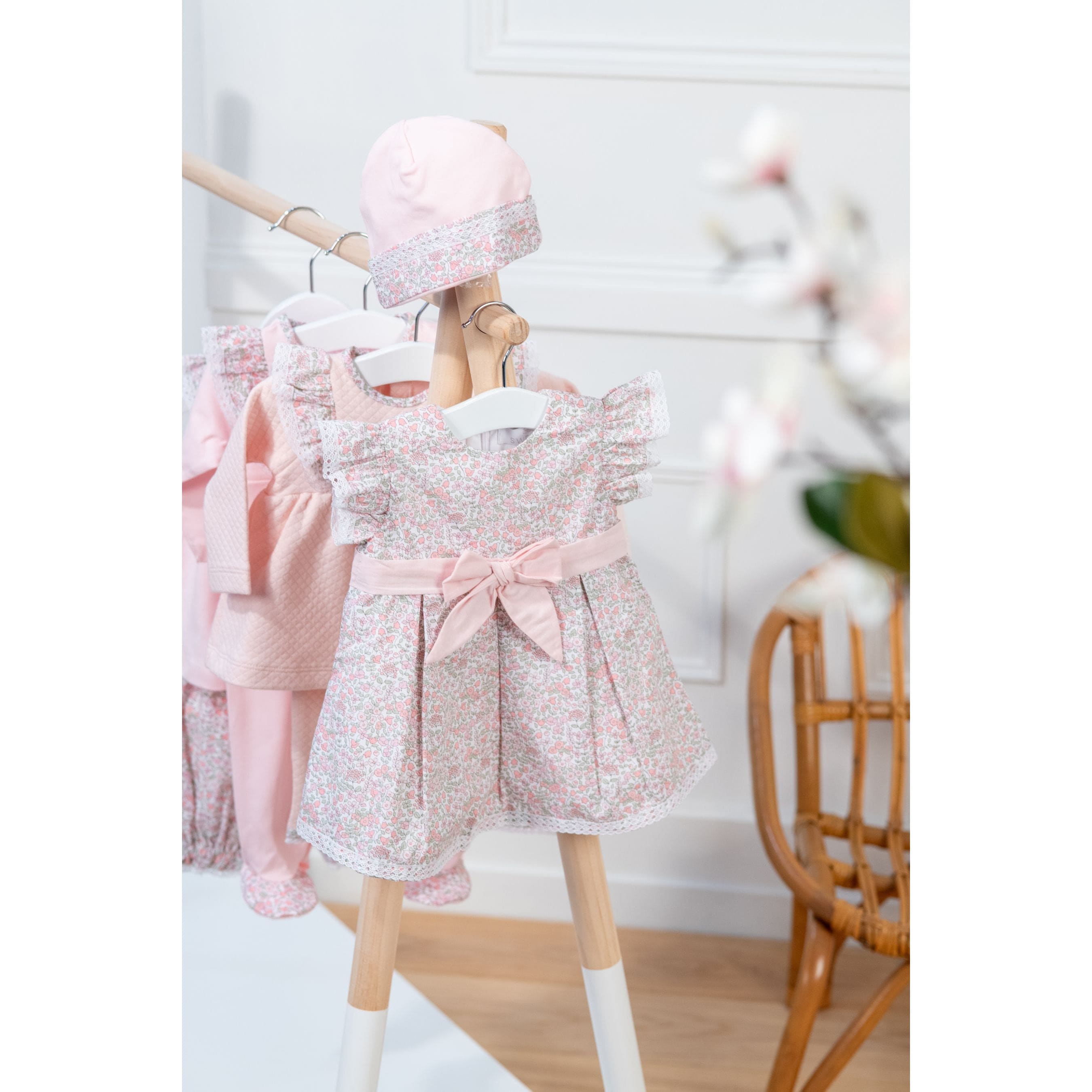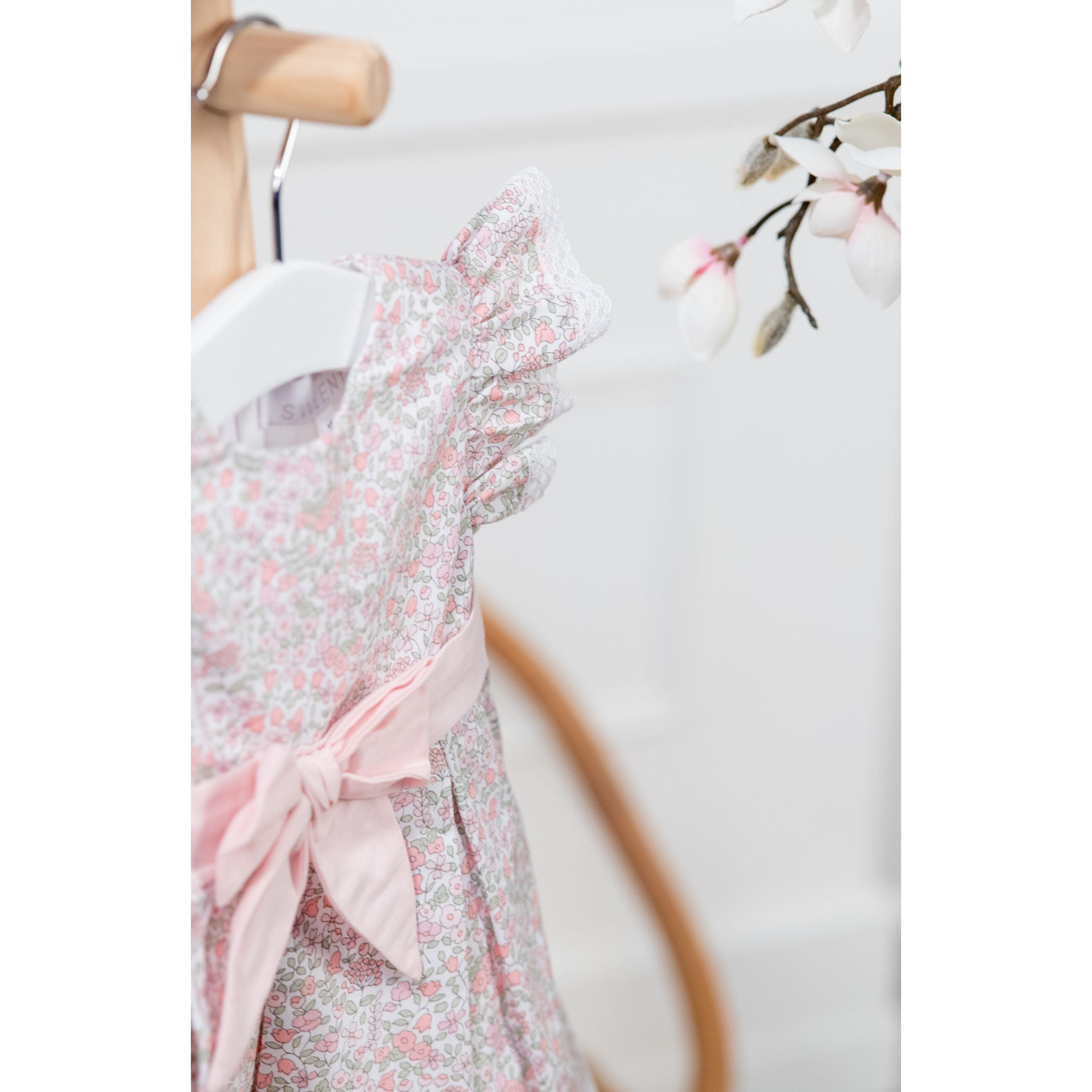 A beautiful pink cotton dress for baby girls patterned with a charming, pale pink floral print and lace trims. Lovely for a special occasion, this sleeveless style a fitted bodice and a full, box-pleated skirt. It is lined for comfort and fastens neatly with a concealed zip on the back. A pink belt with a gorgeous bow on the front, trims the waist for a pretty finish. It comes with pink bloomer shorts to complete the outfit.