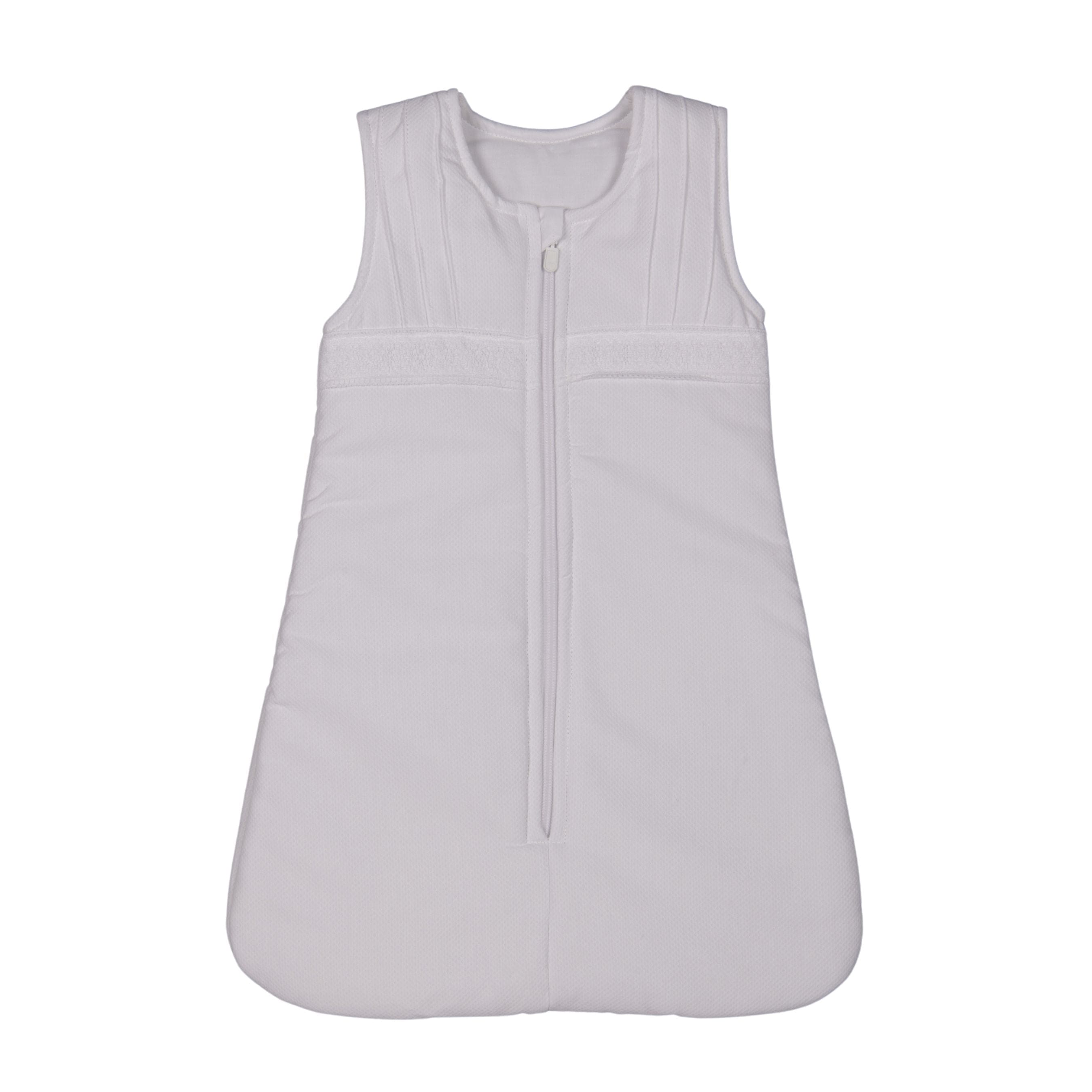Lovely white sleeping bag for baby boys and girls made in soft cotton piqué. Lined in cosy cotton jersey, it is lightly padded to keep baby warm and comfortable. The front features neat pintuck detailing and white lace. To help get baby in and out easily, it has a zip on the front.