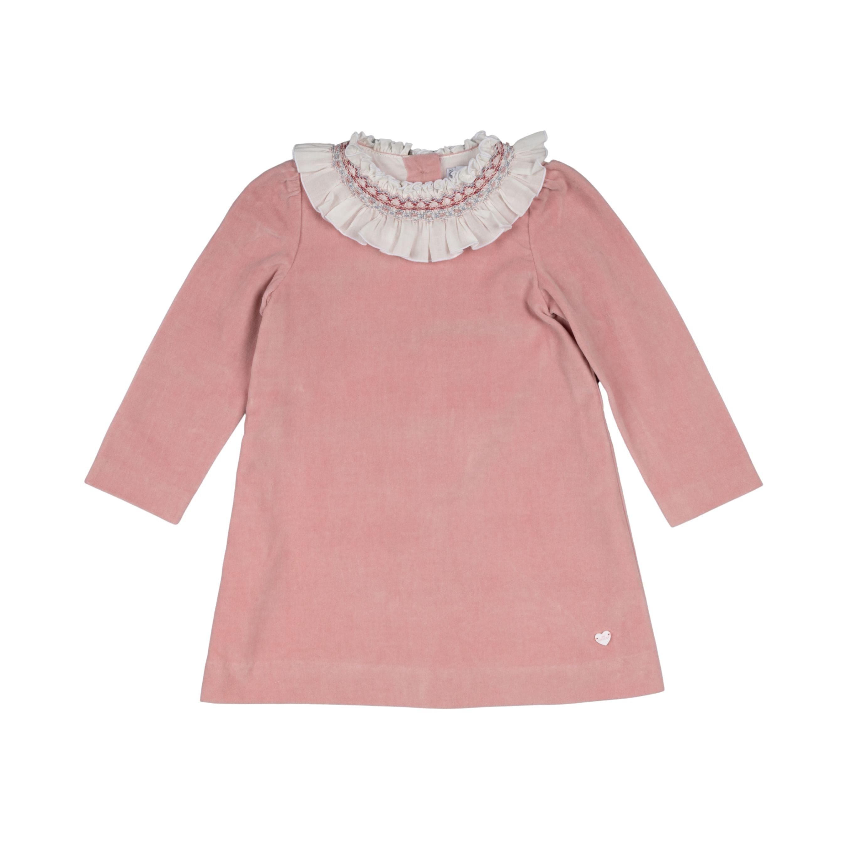 Pink dress for younger girlsi, made in soft velvet. This charming style has a pretty, oversized white collar, with delicate hand-smocked embroideries. It has long sleeves and fastens neatly with mother-of-pearl buttons on the back.