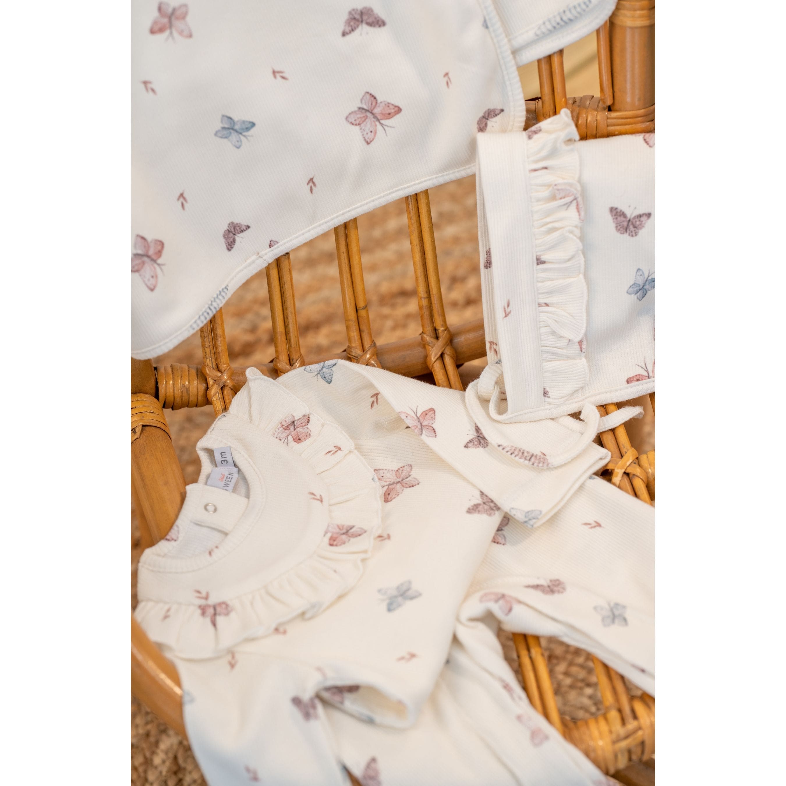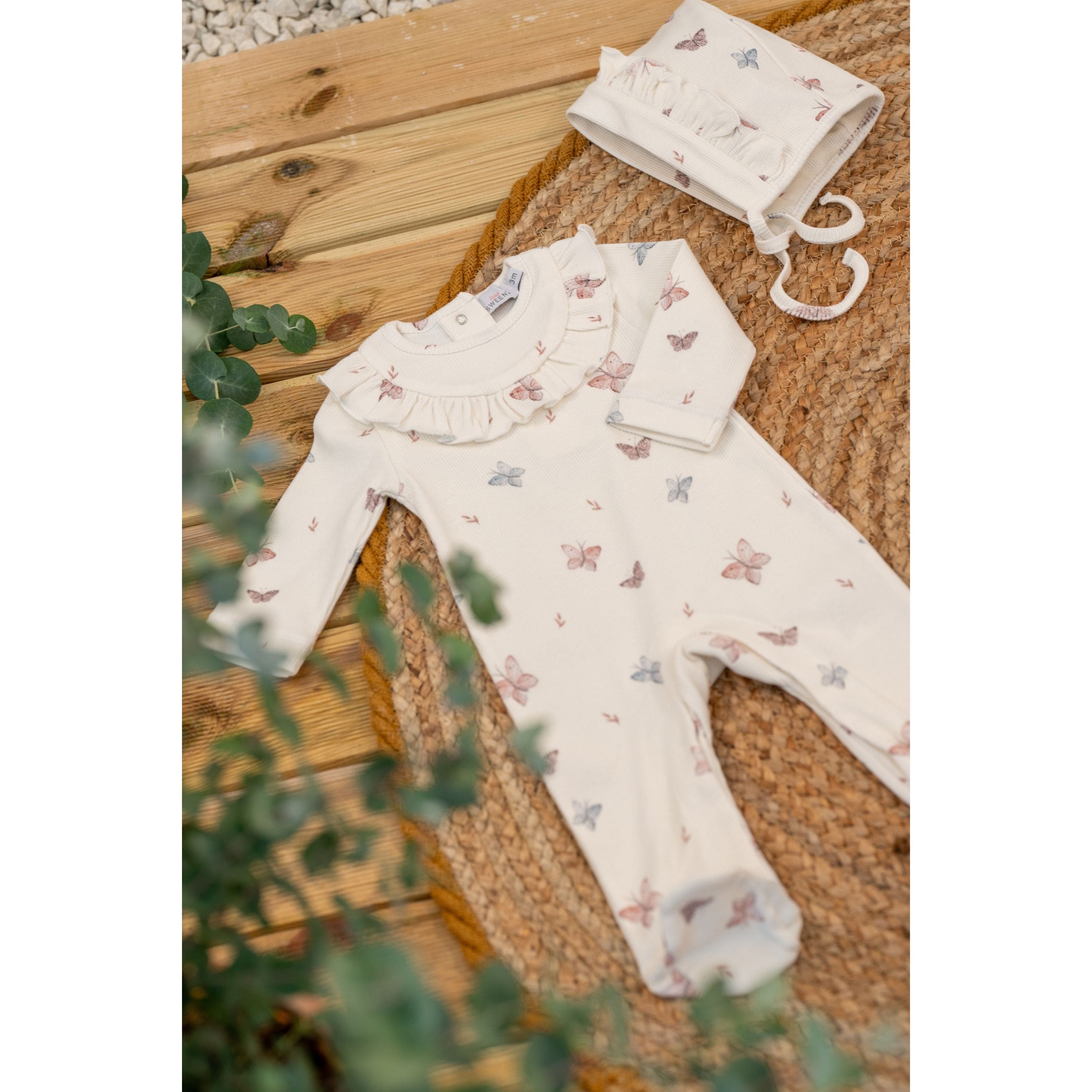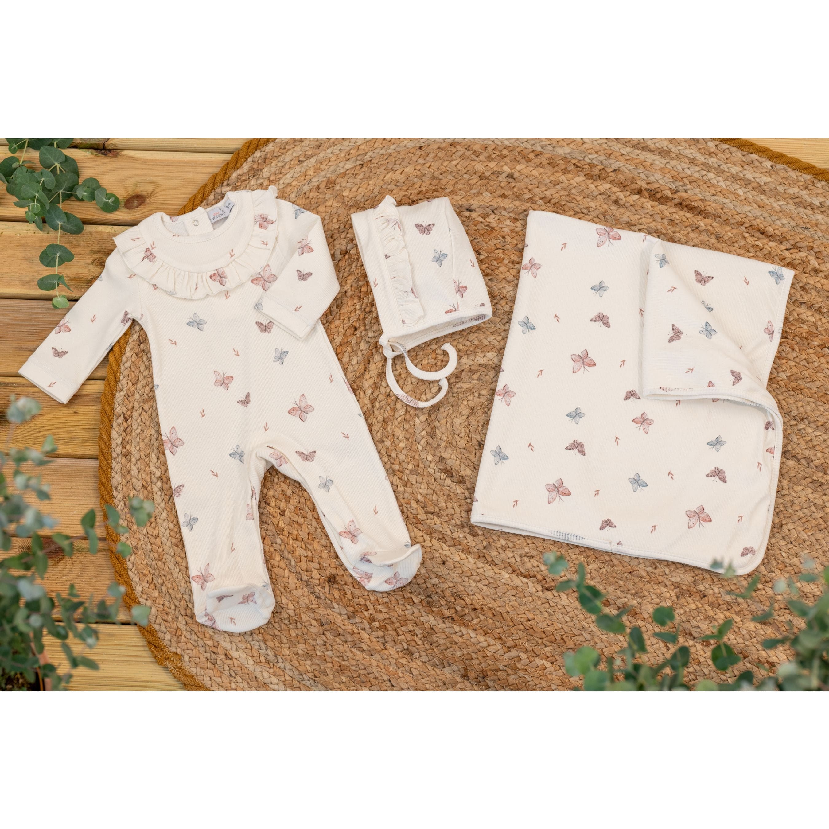 An adorable ivory and pink babysuit set for girls, made in soft ribbed cotton jersey. The babygrow, blanket and hat have matching cute butterfly prints. The lovely babygrow fastens easily with poppers on the front and between the legs.