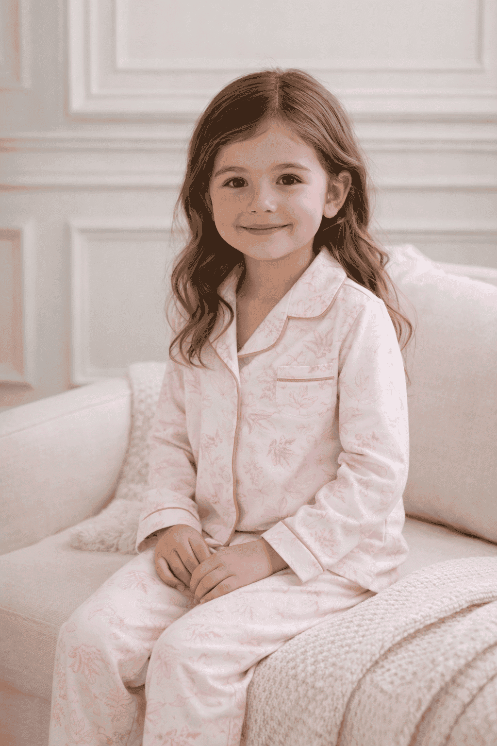 Soft and refined, this two-piece set in our exclusive pink Toile de Jouy is elevated by a tailored collar and delicate contrast piping. An elegant Bebe Sweeny essential designed for comfort, lounging and sleep.
