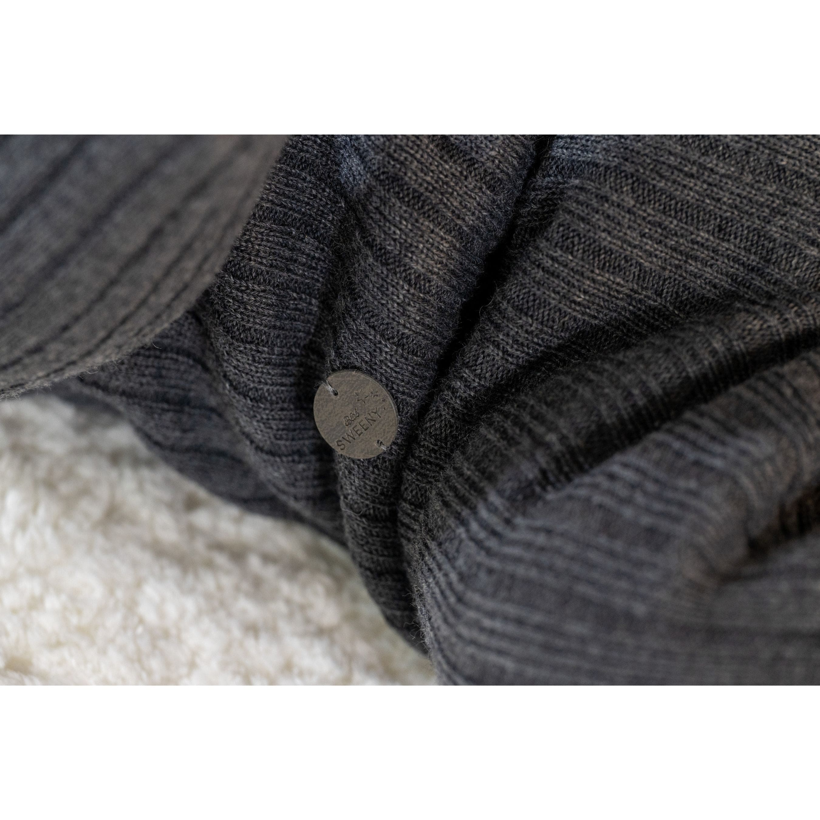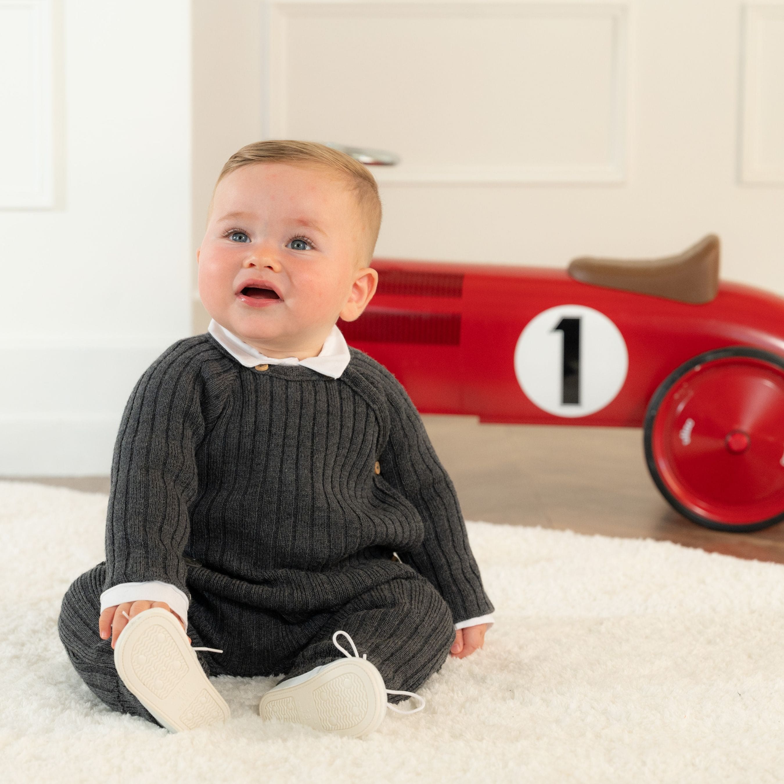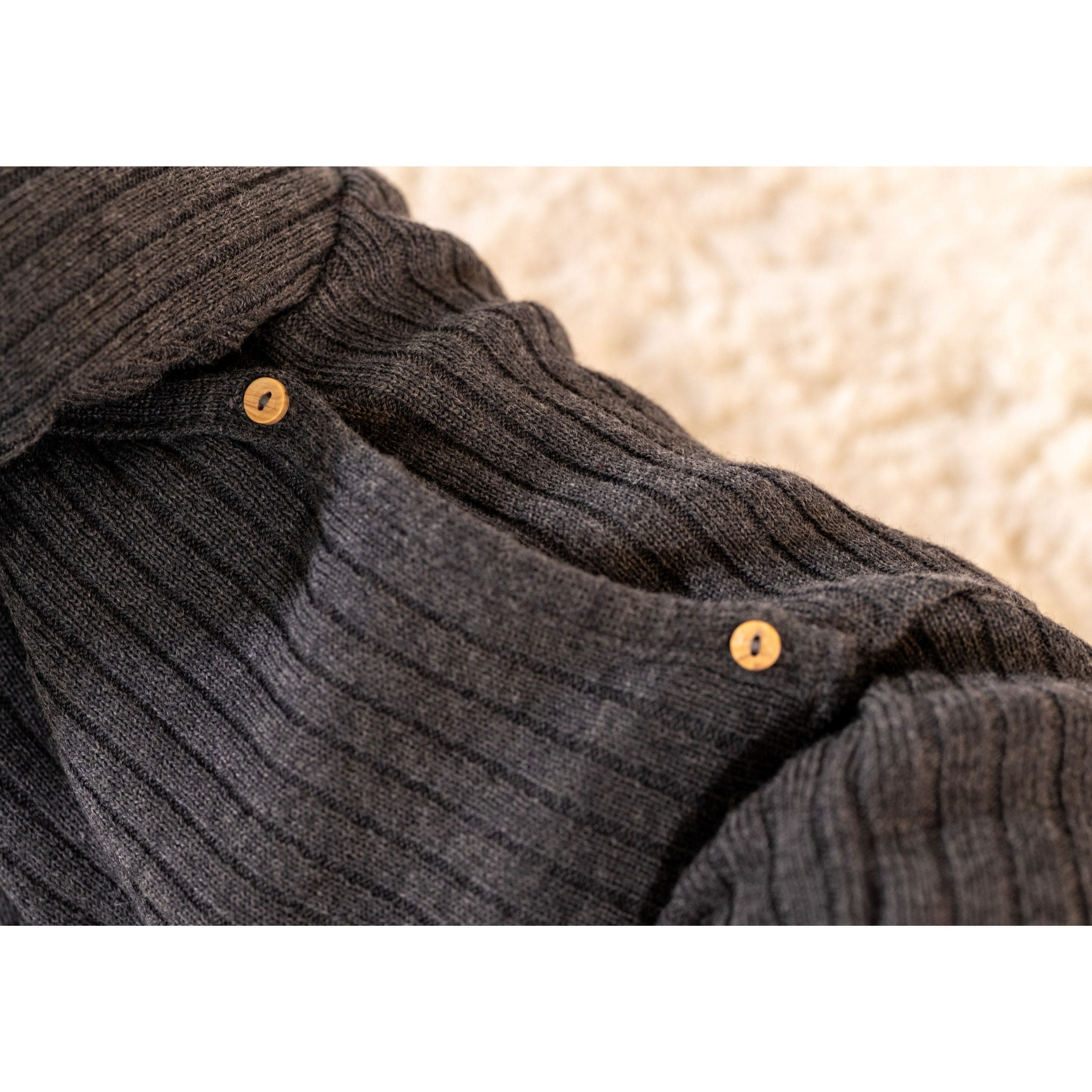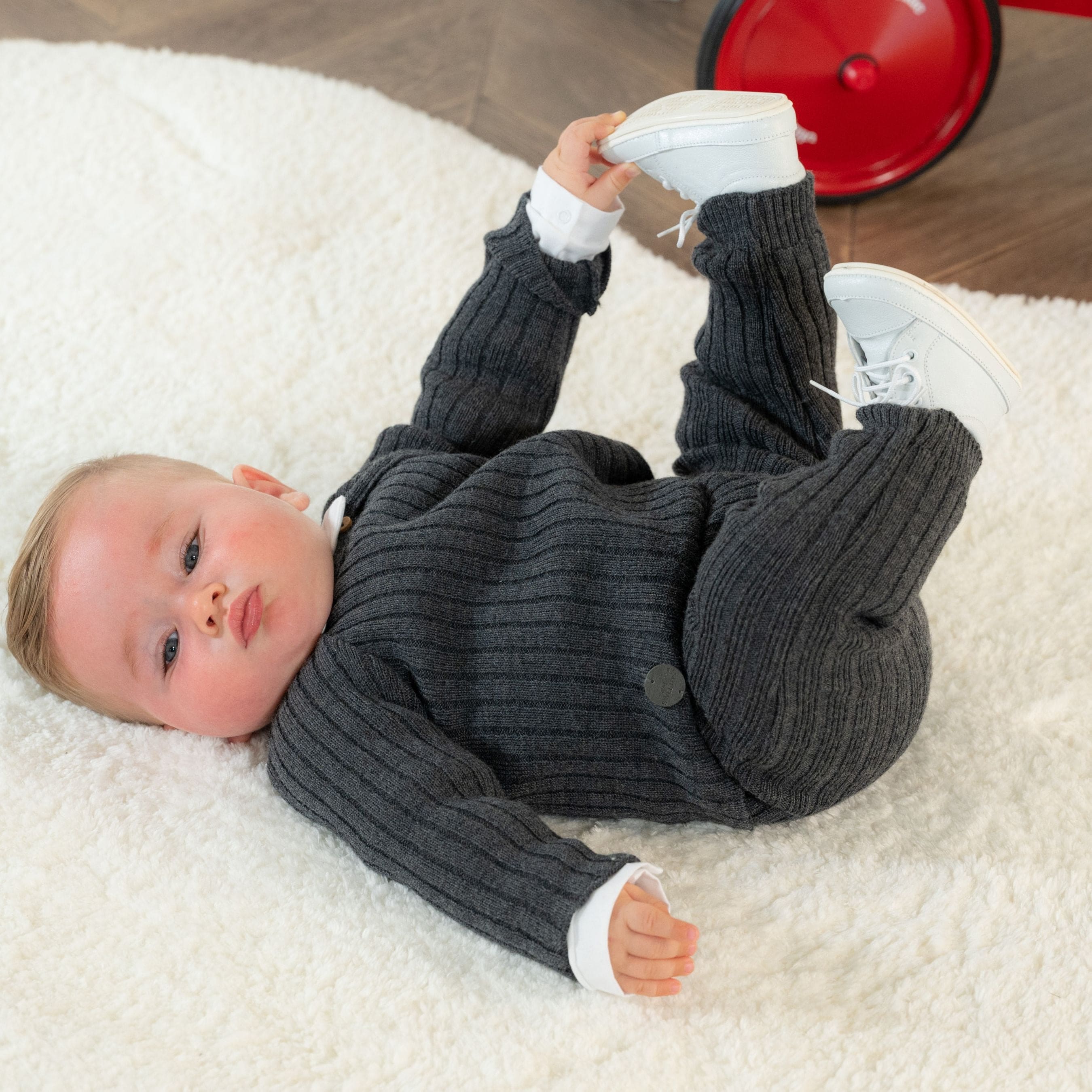 Baby boy gorgeous charcoal grey trouser set. Super soft and comfortable, the sweater fastens on the side with natural beige wooden buttons. The matching trousers are full length and have an elasticated waistband. Complete the set with the matching hat and blanket available in the same collection.