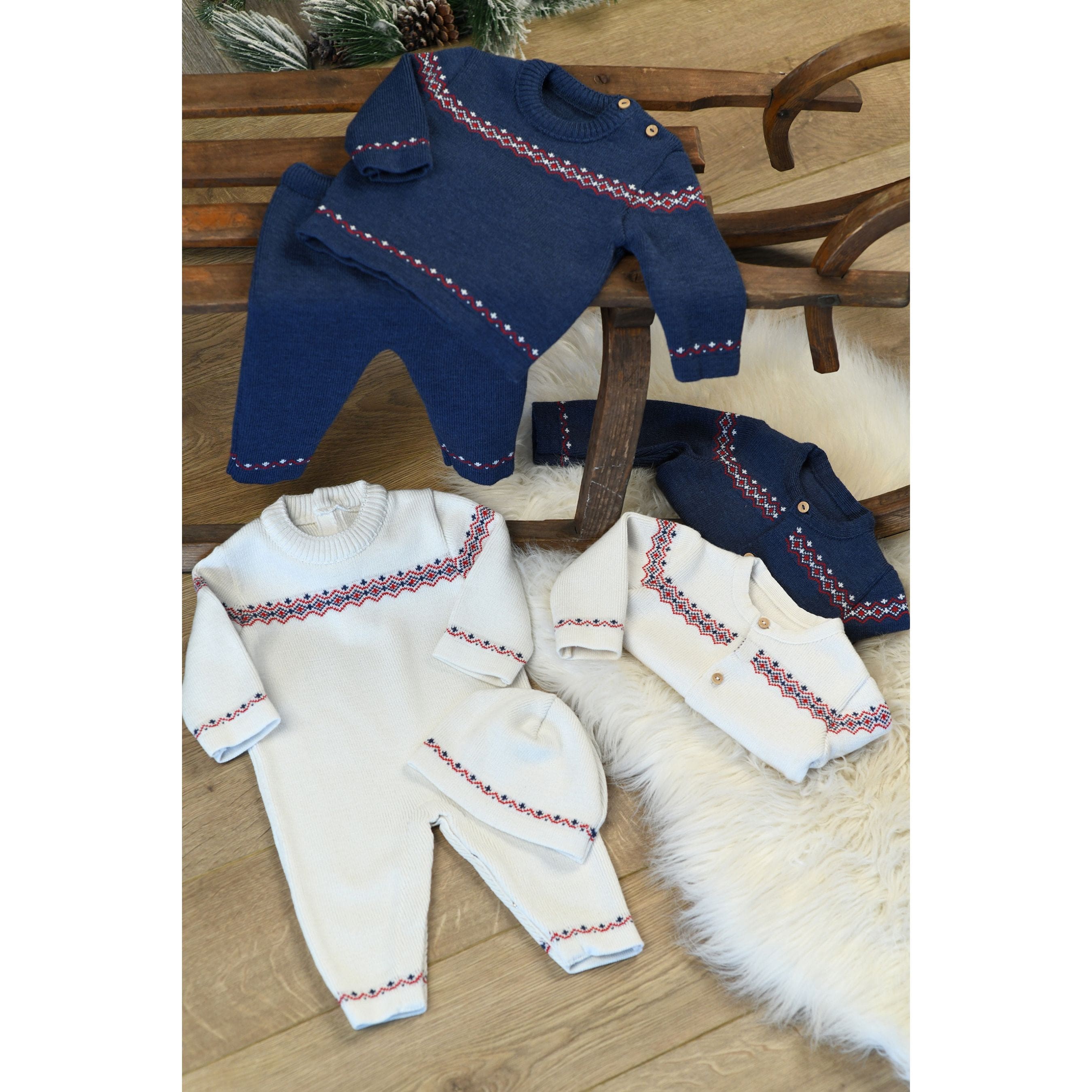 Ivory knitted romper for baby boys and girls made in a luxuriously soft wool blend. This cosy lightweight knit features a charming red and navy blue snowflake detailing on the front and cuffs. There are buttons on the back and practical poppers between the legs for easy dressing.