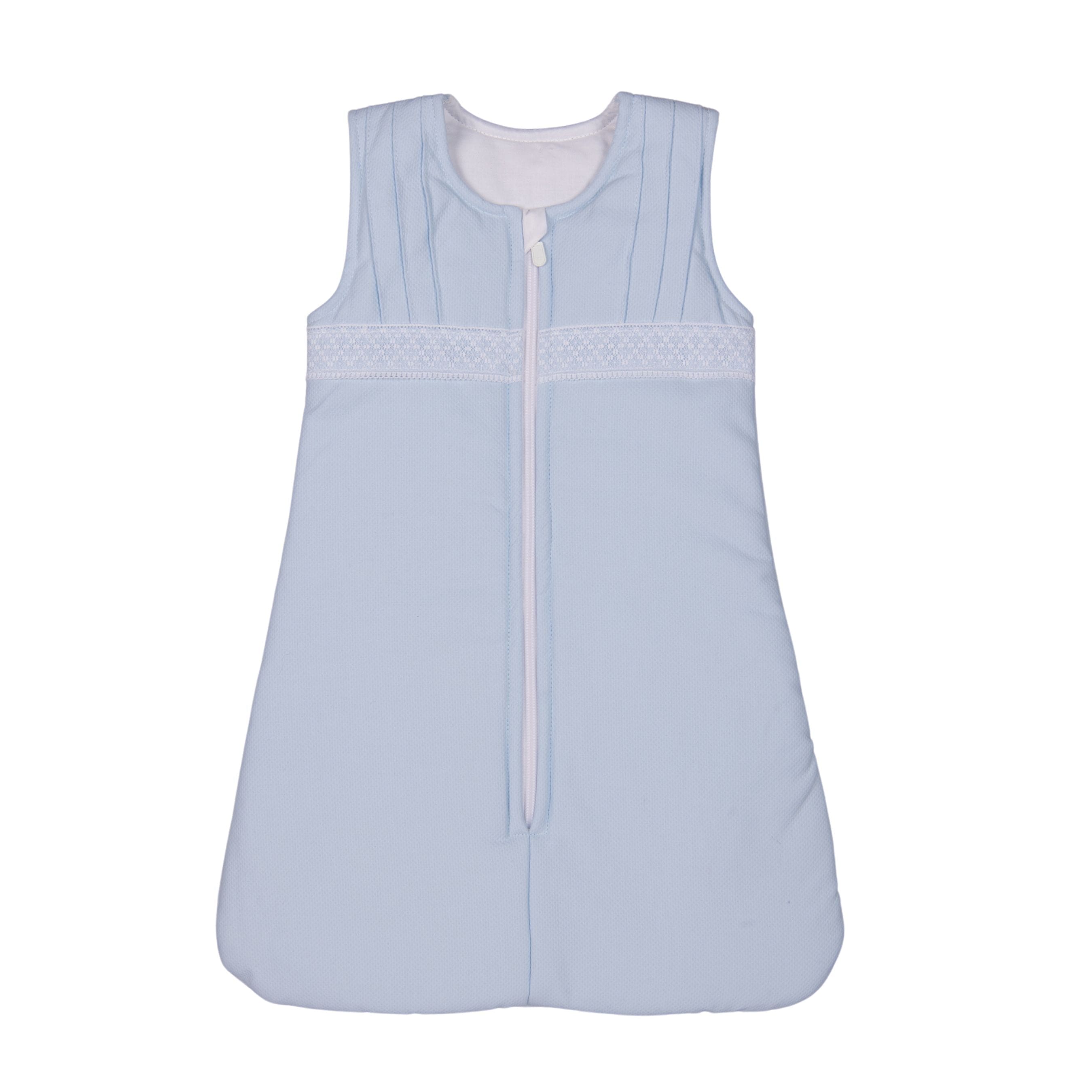 Lovely blue sleeping bag for baby boys made in soft cotton piqué. Lined in cosy cotton jersey, it is lightly padded to keep baby warm and comfortable. The front features neat pintuck detailing and white lace. To help get baby in and out easily, it has a zip on the front.