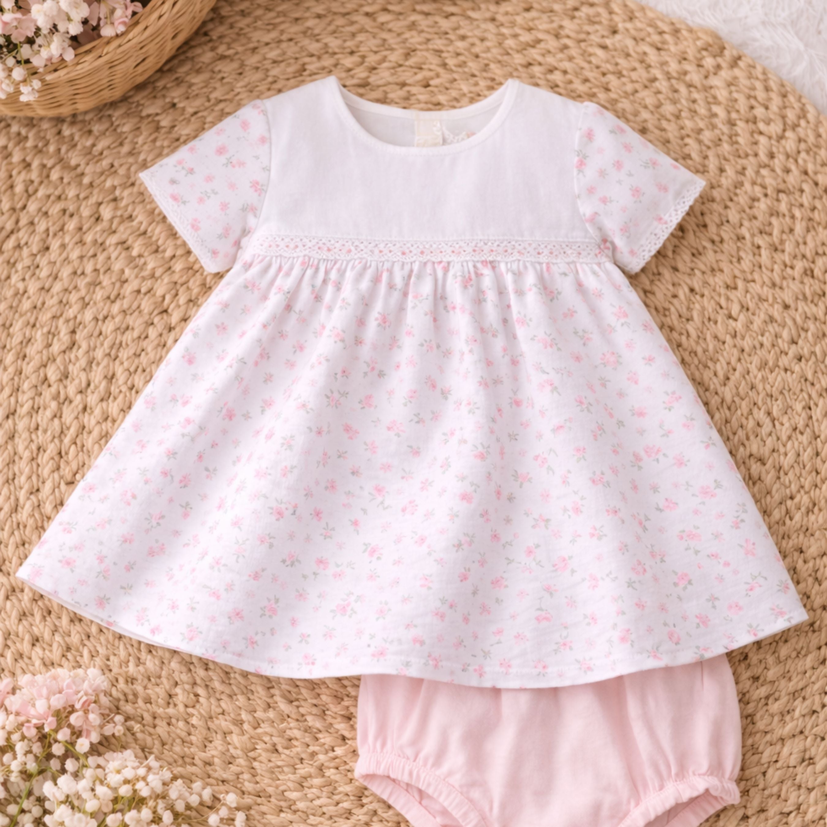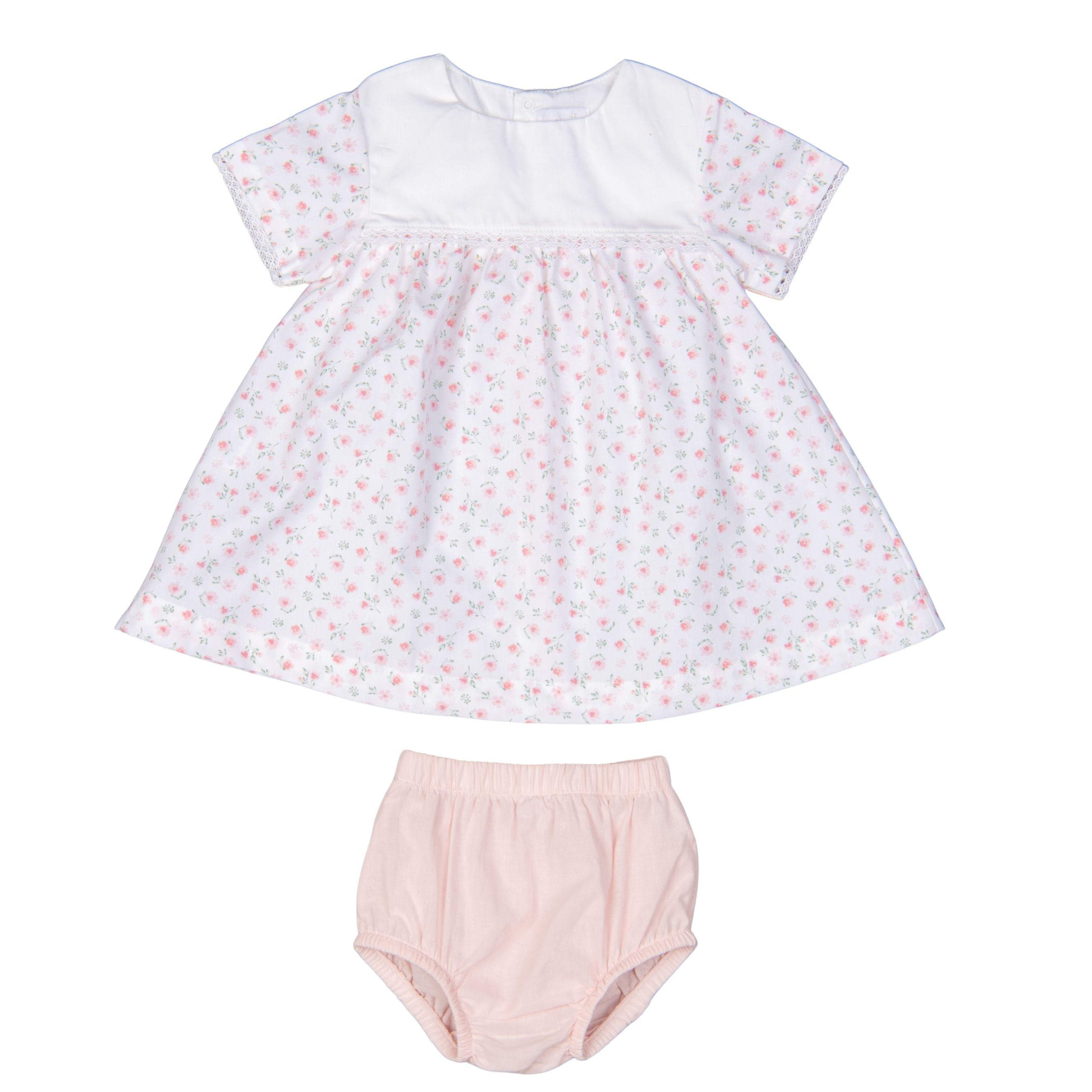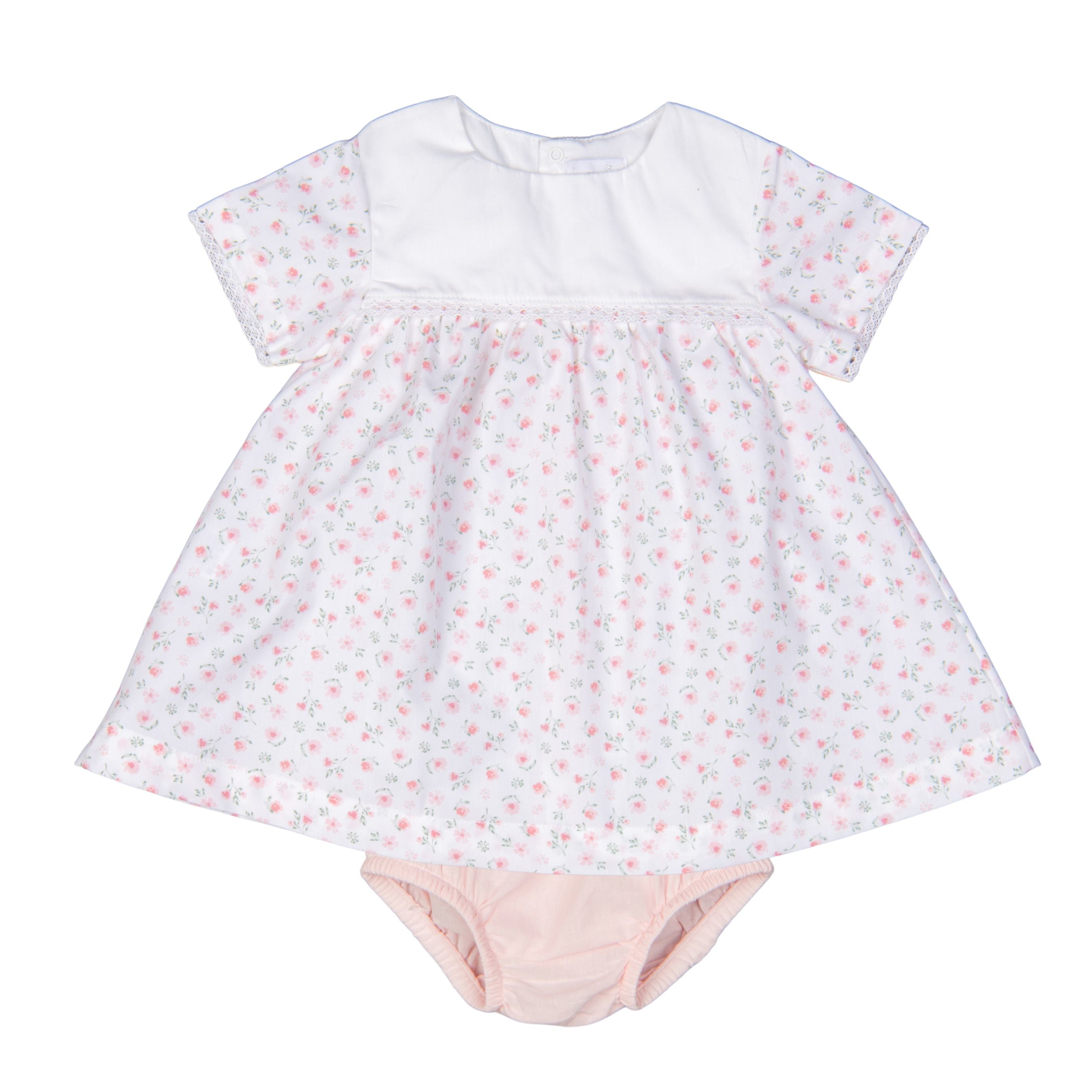 This charming baby dress features a delicate floral print with refined lace trim along the chest seam and sleeves. The dress opens at the back with snap buttons for easy dressing. Made from soft cotton, it is lightweight and comfortable for Summer. The gathered skirt creates a beautifully classic silhouette, while the matching soft pink bloomer completes the outfit and ensures comfort and coverage.