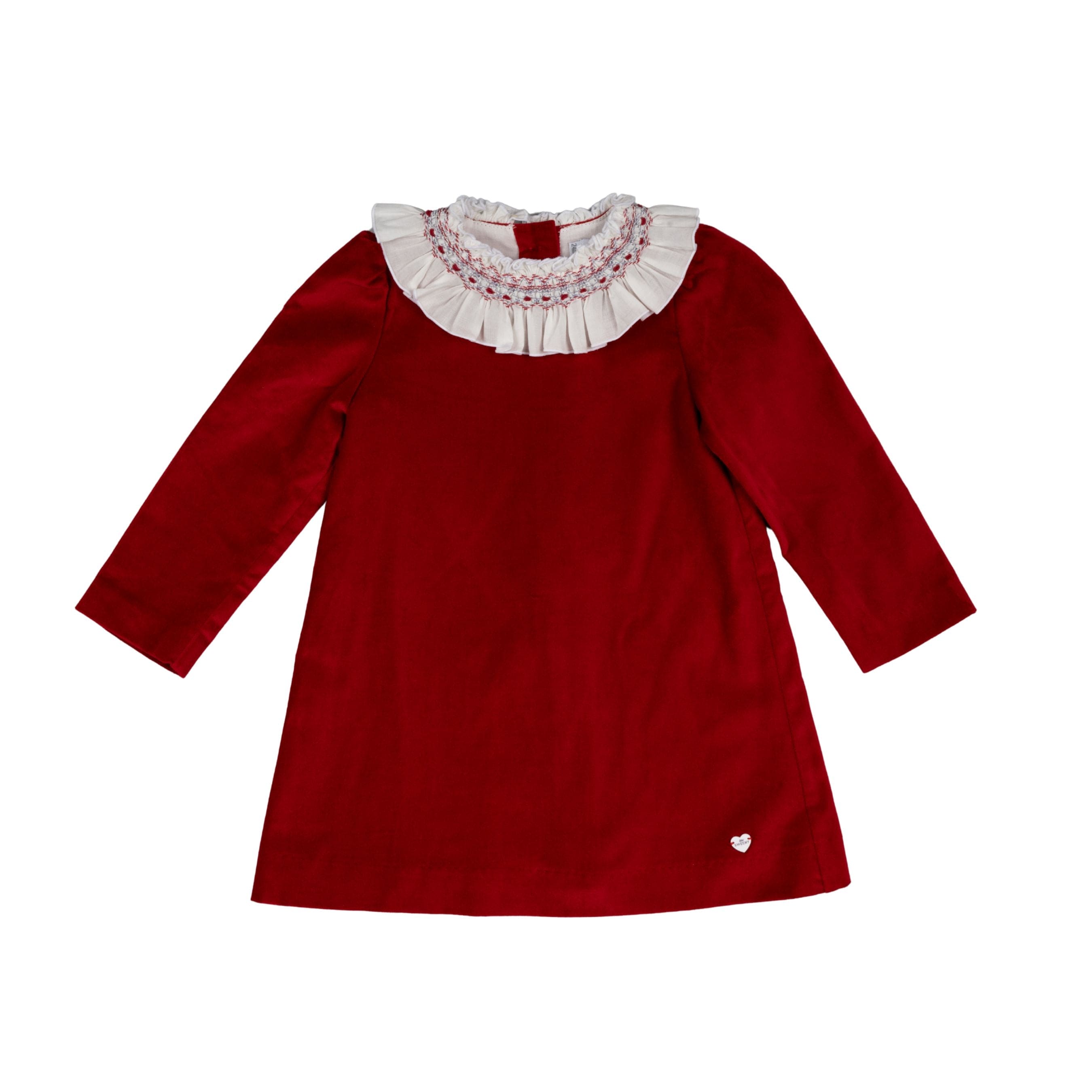 Red dress for younger girlsi, made in soft velvet. This charming style has a pretty, oversized white collar, with delicate hand-smocked embroideries. It has long sleeves and fastens neatly with mother-of-pearl buttons on the back.