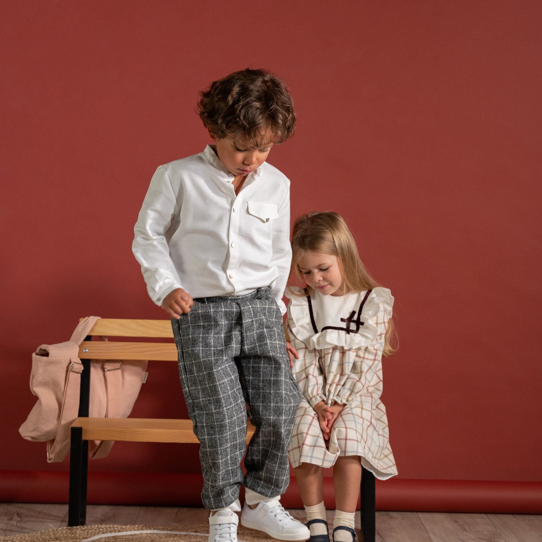 These grey and ivory checked trousers are perfect for young boys. The soft flannel fabric ensures comfort, and the design includes front and back pockets, as well as adjustable waistband and ivory elasticated cuffs. Made with high quality materials, these trousers are a smart choice for any occasion.