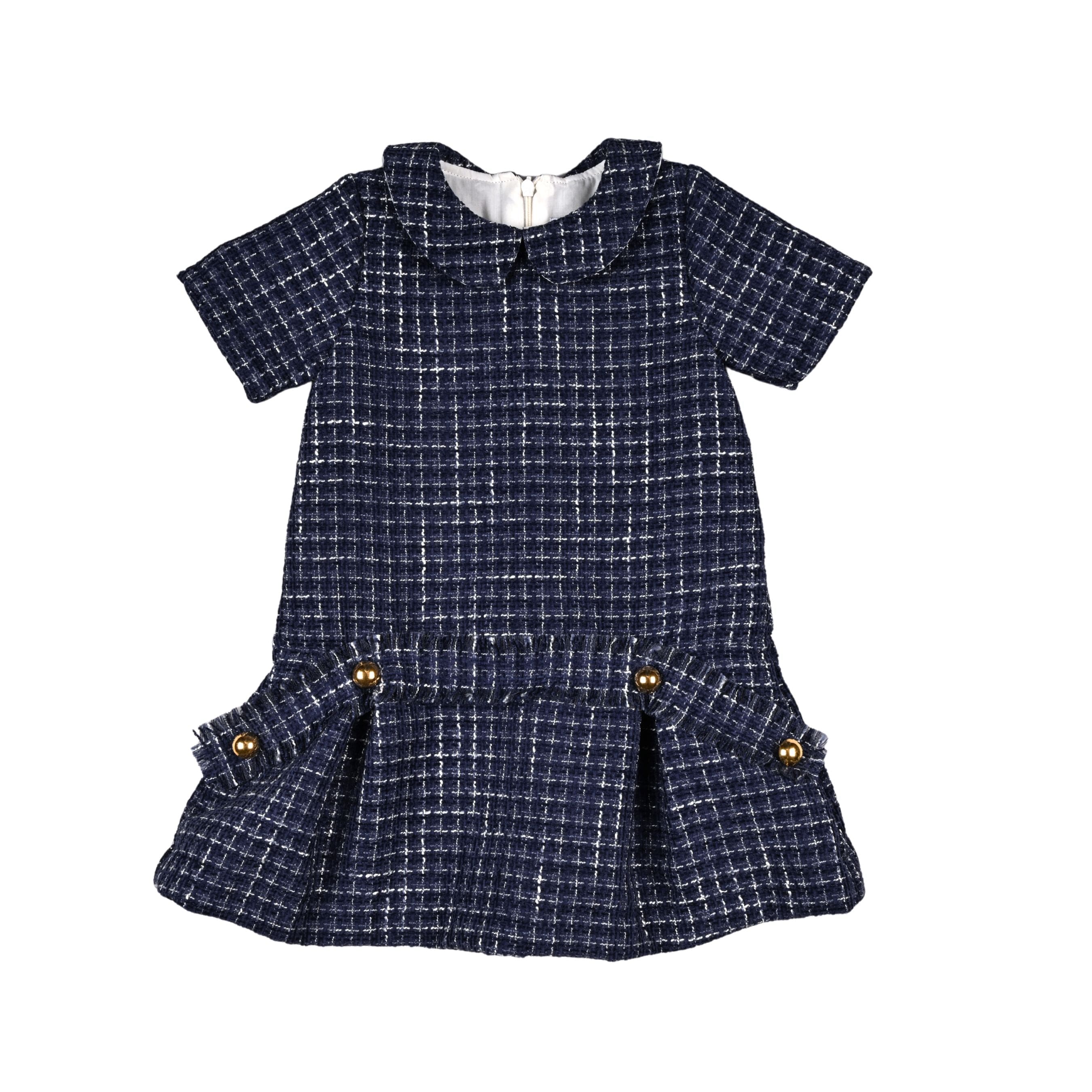 A navy blue tweed dress for girls woven with white yarn thread for a distinctive, textured look. Lined with cotton fabric, it has short sleeves and a Peter Pan collar. There is a fringed trim across the front, decorated with golden buttons. Lined in lightweight cotton for comfort, the dress fastens with a concealed zip on the back.