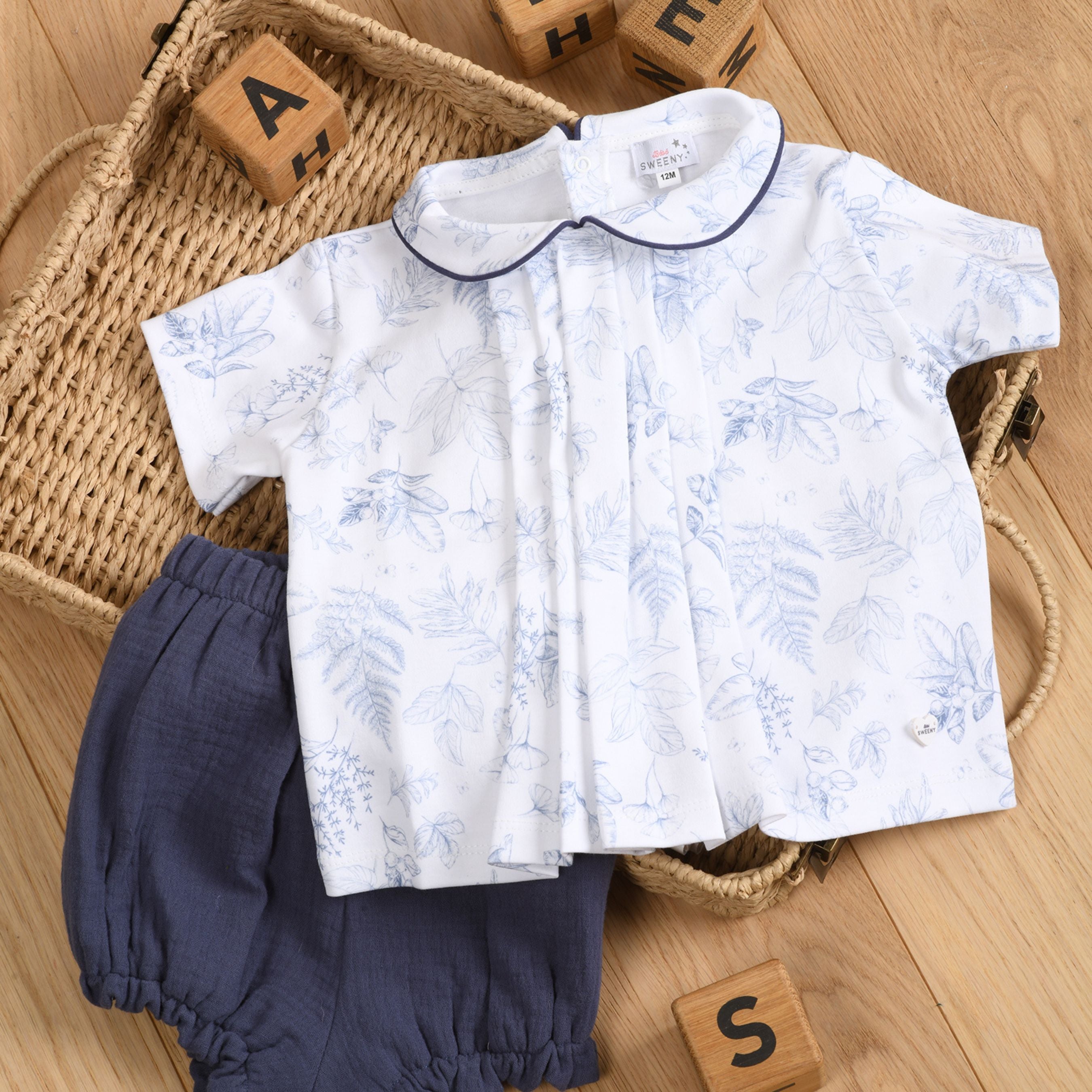 A refined summer set for baby boys featuring a T-shirt with a Peter Pan collar finished with navy piping and delicate front pleats, paired with matching bloomer shorts with soft elastic at the waist and legs for comfort. The top is crafted in smooth interlock cotton, while the bloomer is made from lightweight double gauze cotton. The blue Toile de Jouy print brings a timeless and elegant touch. Ideal for warm days, this set combines lightness, comfort, and a polished silhouette.